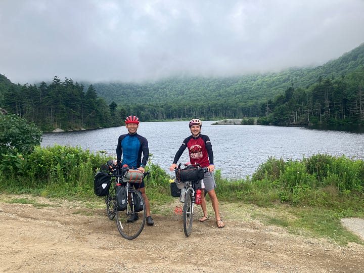 Isn’t so cool when things seem like they’re going wrong, they end up working out in ways you never expect? Sometimes things just simply go wrong, but in my experience magical things come from difficult/frustrating/uncertain times. Today was a prime example of that. We were ready to get on the road at 7am and just waiting for our new friends — who were very kind to let us leave our food in their car — to wake up. I took a walk down to the creek, and on my way back said good morning to another pair of campers. They had a big sprinter van and mountain bikes on the back. My “good morning” led to them asking if there was a road bike race nearby because they saw our jerseys. Before I knew it I was giving them the whole story of our trip, and Jima walked over to join the conversation too. Not only was it a lovely chat, but our other friends woke up during this time. We started riding shortly after and met the mountain bikers again at Beaver Brook Pond at the top of the first hill. They took our photo and offered to host/help me if I pass through Boston on the way home! To top it all off, the guy goes by “Magic”.